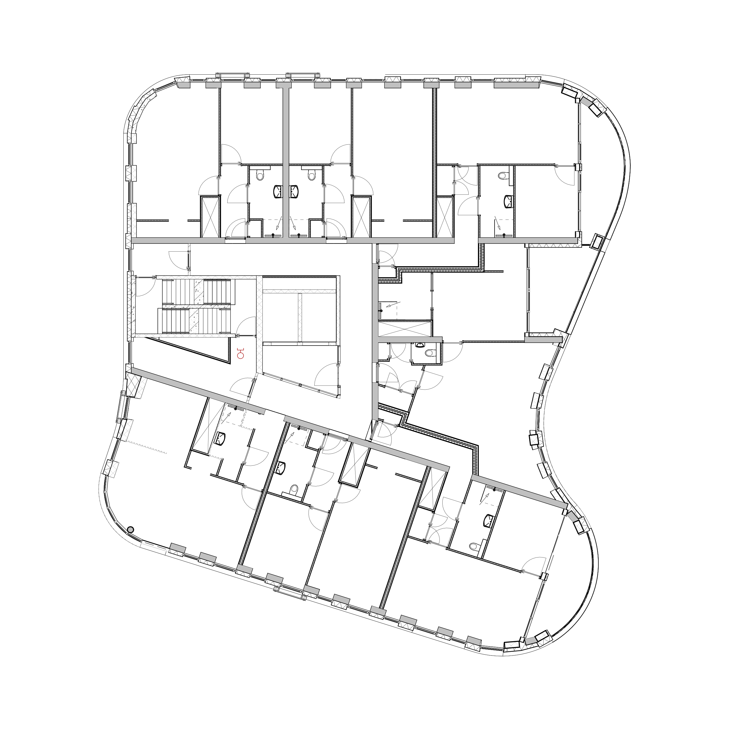 De centrale hal met liften en trappen vormt het hart van de verdieping. Van hieruit loop je direct naar jouw appartement. Door de slimme indeling heeft ieder appartement zijn eigen rustige ligging, met veel privacy en optimale lichtinval.